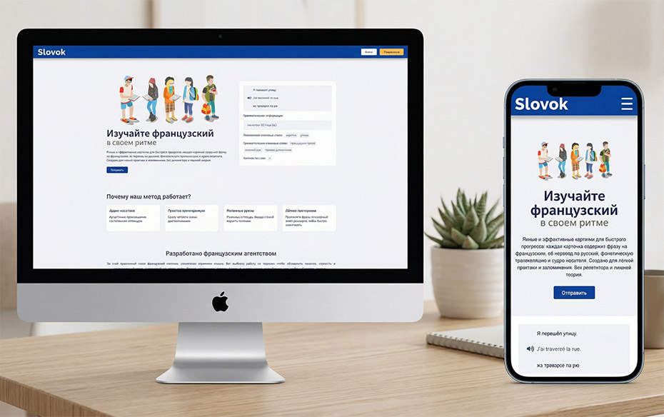 Slovok est une plateforme d’apprentissage du français conçue pour un public russophone. Nous avons imaginé et développé l’ensemble de l’outil sous WordPress, en partant d’un besoin simple : proposer un espace clair, fiable et évolutif pour accompagner les apprenants dans leur progression.